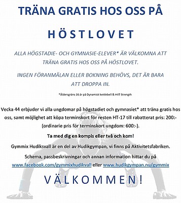 Går du på högstadiet eller gymnasiet? Då tränar du gratis hos oss på höstlovet. Välkommen!