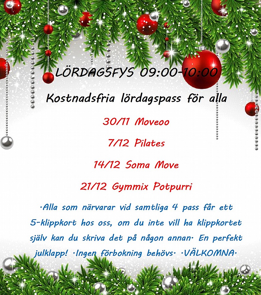 Under de fyra adventshelgerna erbjuder vi kostnadsfria träningspass på lördagar kl 09:00-10:00. Och inte nog med det, alla som närvarar vid samtliga av dessa fyra lördagspass får en julklapp av oss: