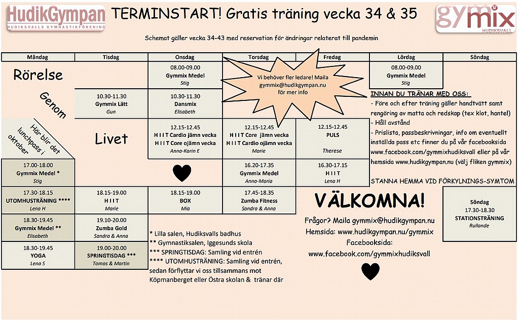 Naturligtvis kommer vi att fortsätta att följa Folkhälsomyndighetens råd och rekommendationer, så utifrån hur pandemin utvecklar sig kan schemat samt förutsättningarna att gå på våra pass komma att ändras, men just nu ser det ut så här, och vi hoppas att det förblir så!