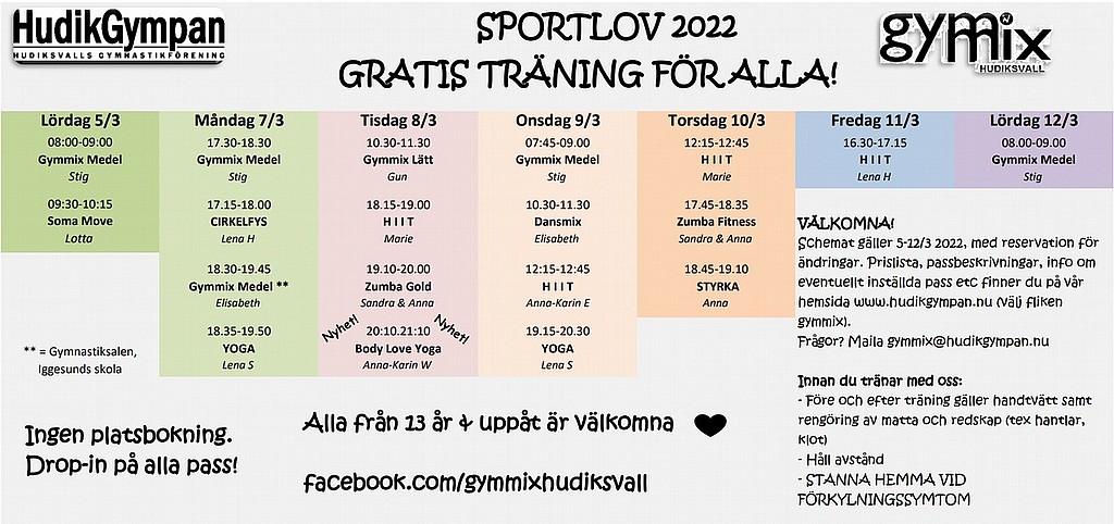 Schema i pdf-format finner du här: Sportlov 2022 & Gymmix v 11-25 2022.pdf