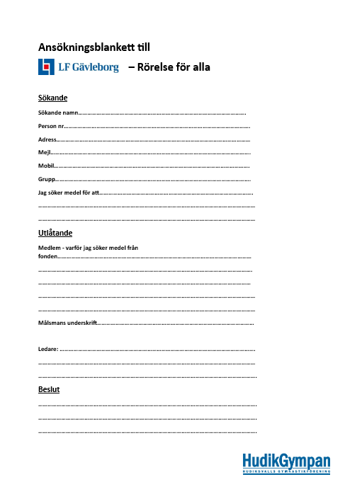 - Ansökan görs löpande av den aktive, målsman eller ledare via formuläret på Hudikgympans hemsida eller fysiskt på kansliet.
